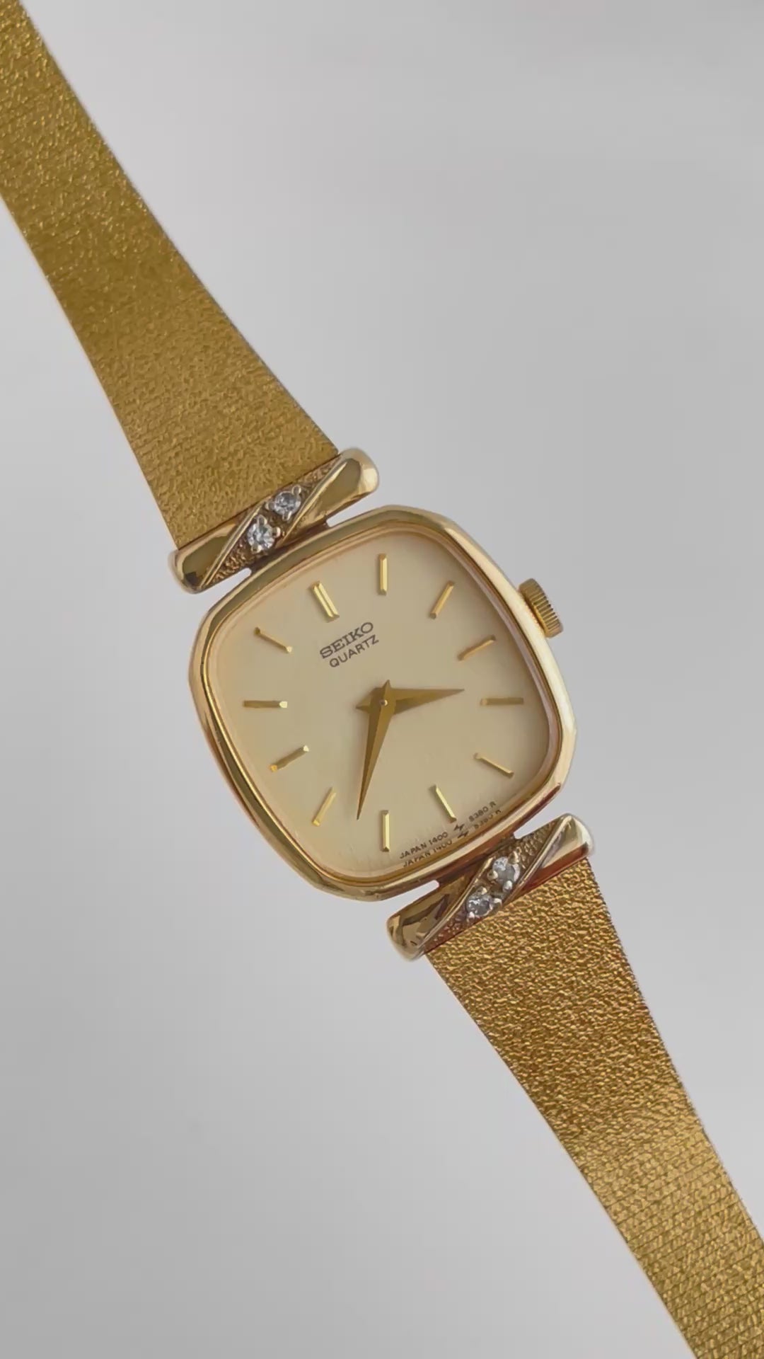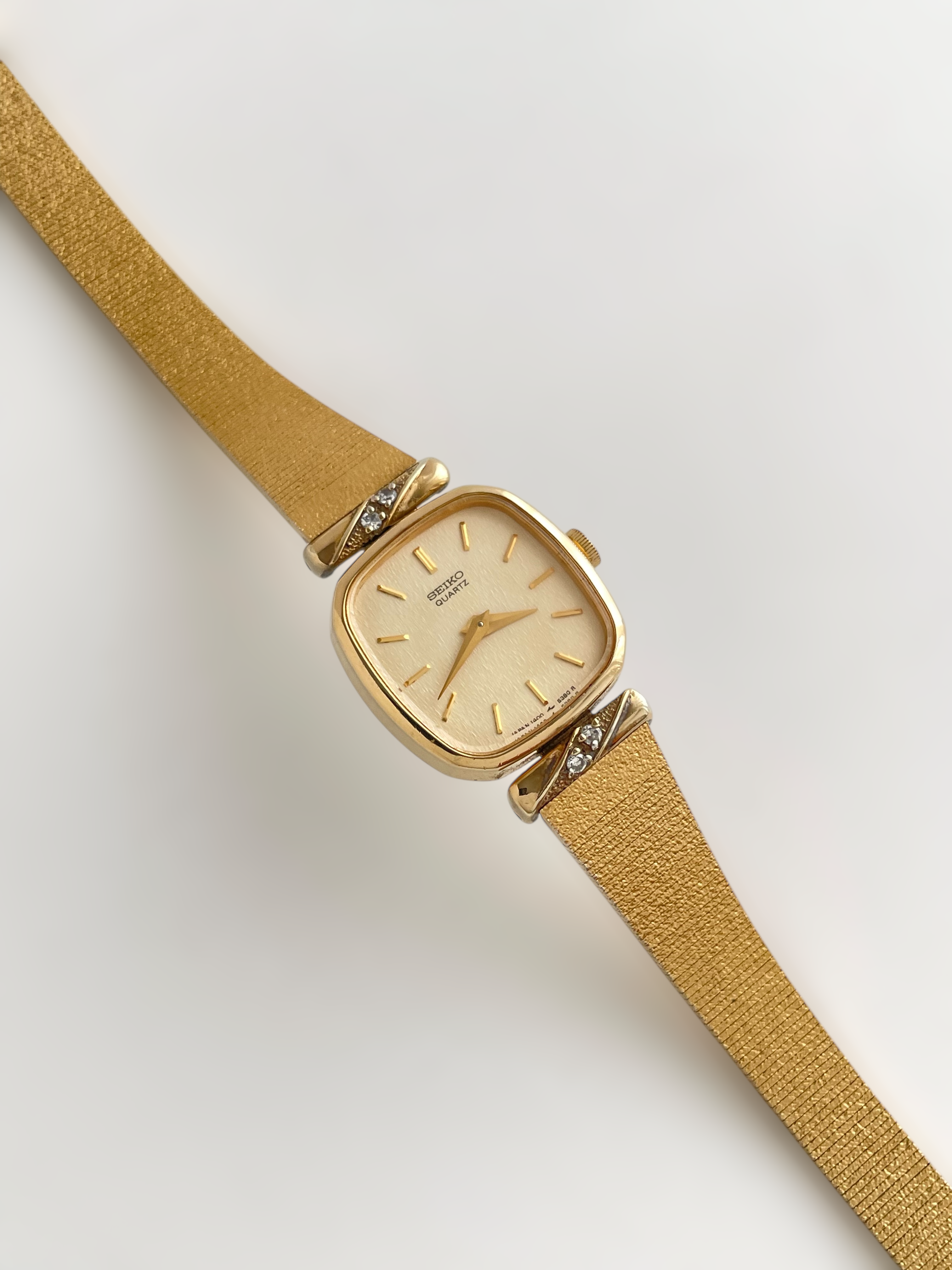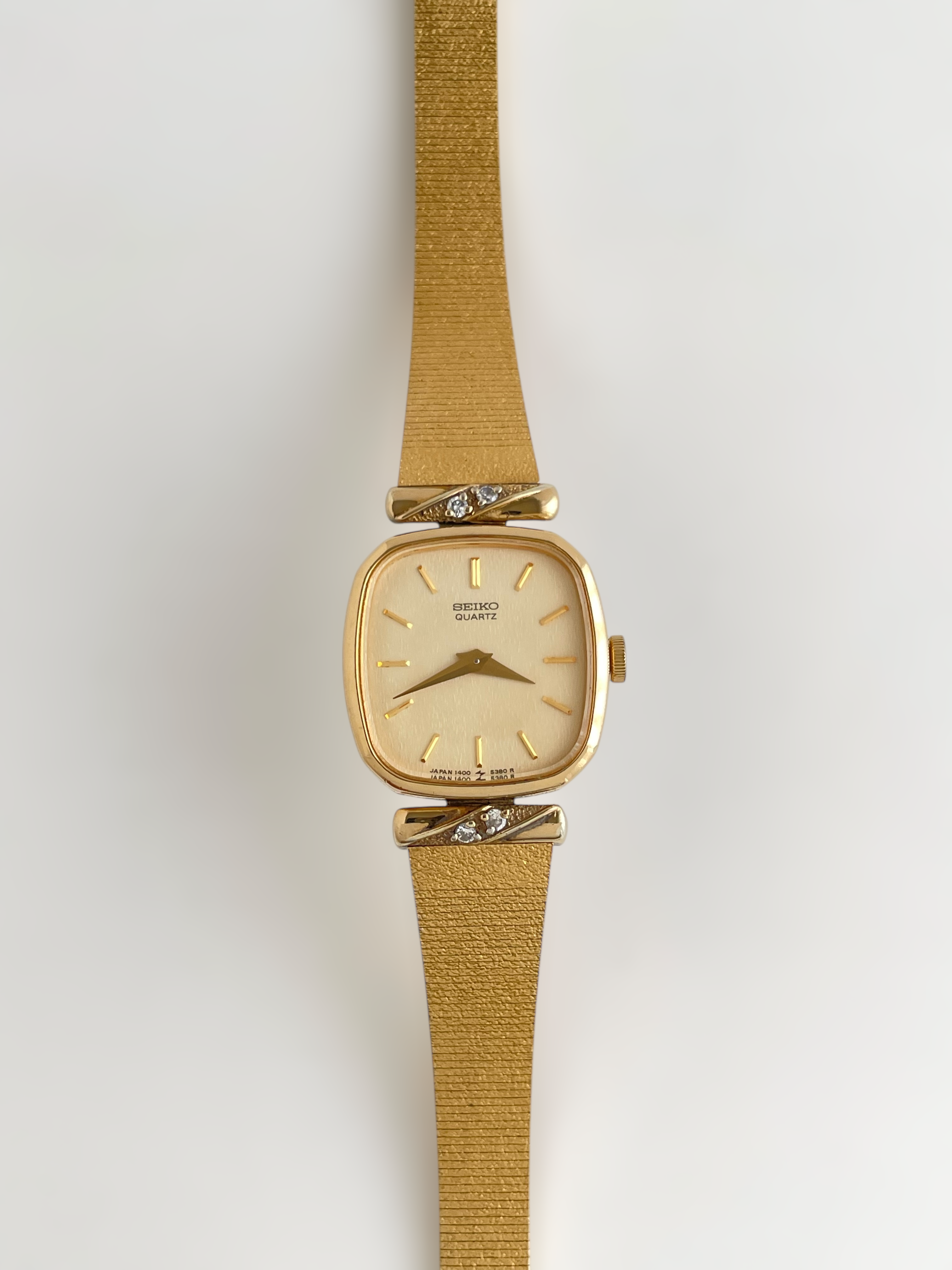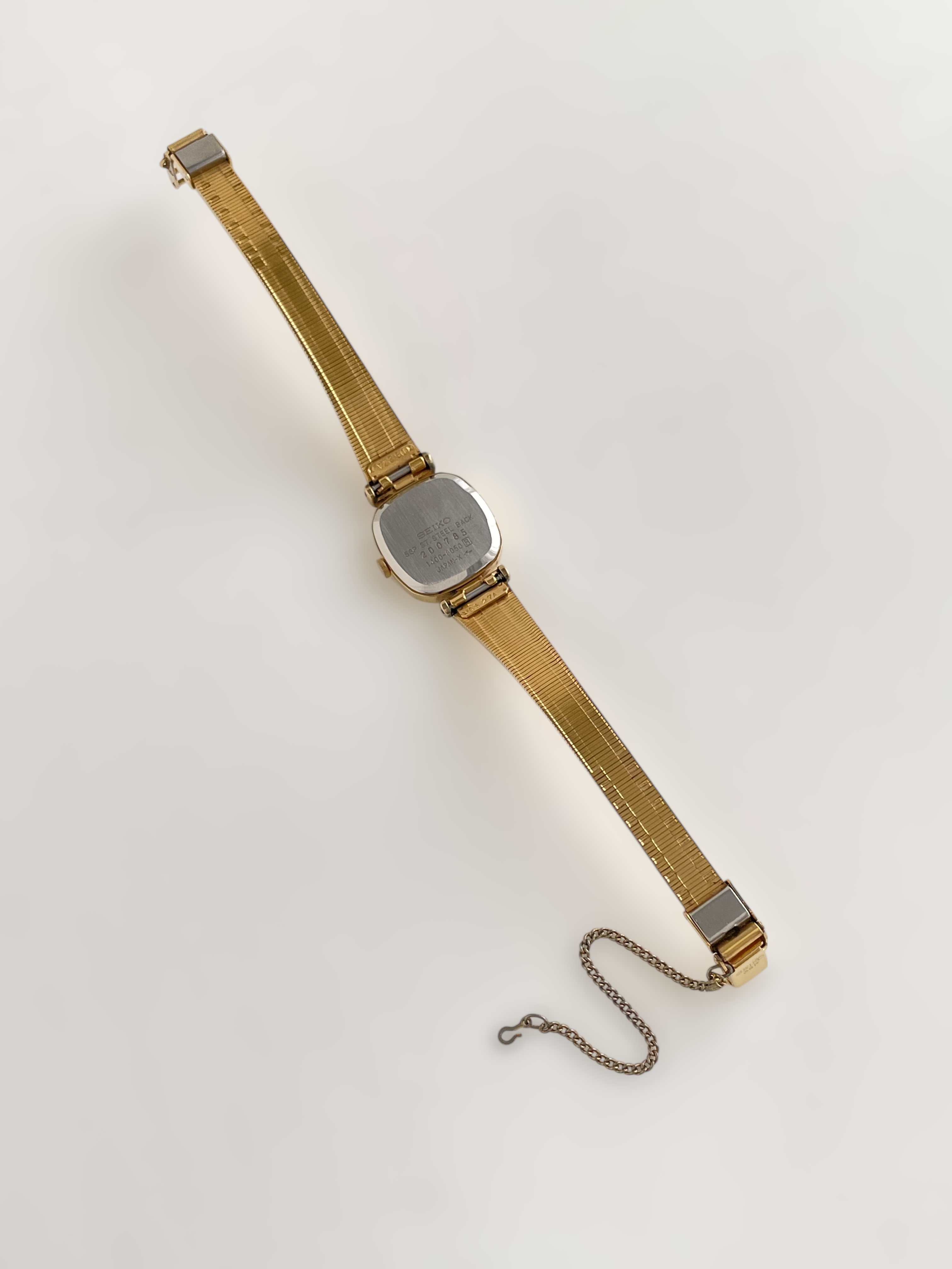 Beautiful vintage and gold plated Seiko watch with a flat bracelet design and a tank case adorned with four small genuine diamonds. Bracelet clasp closure with removable security chain.