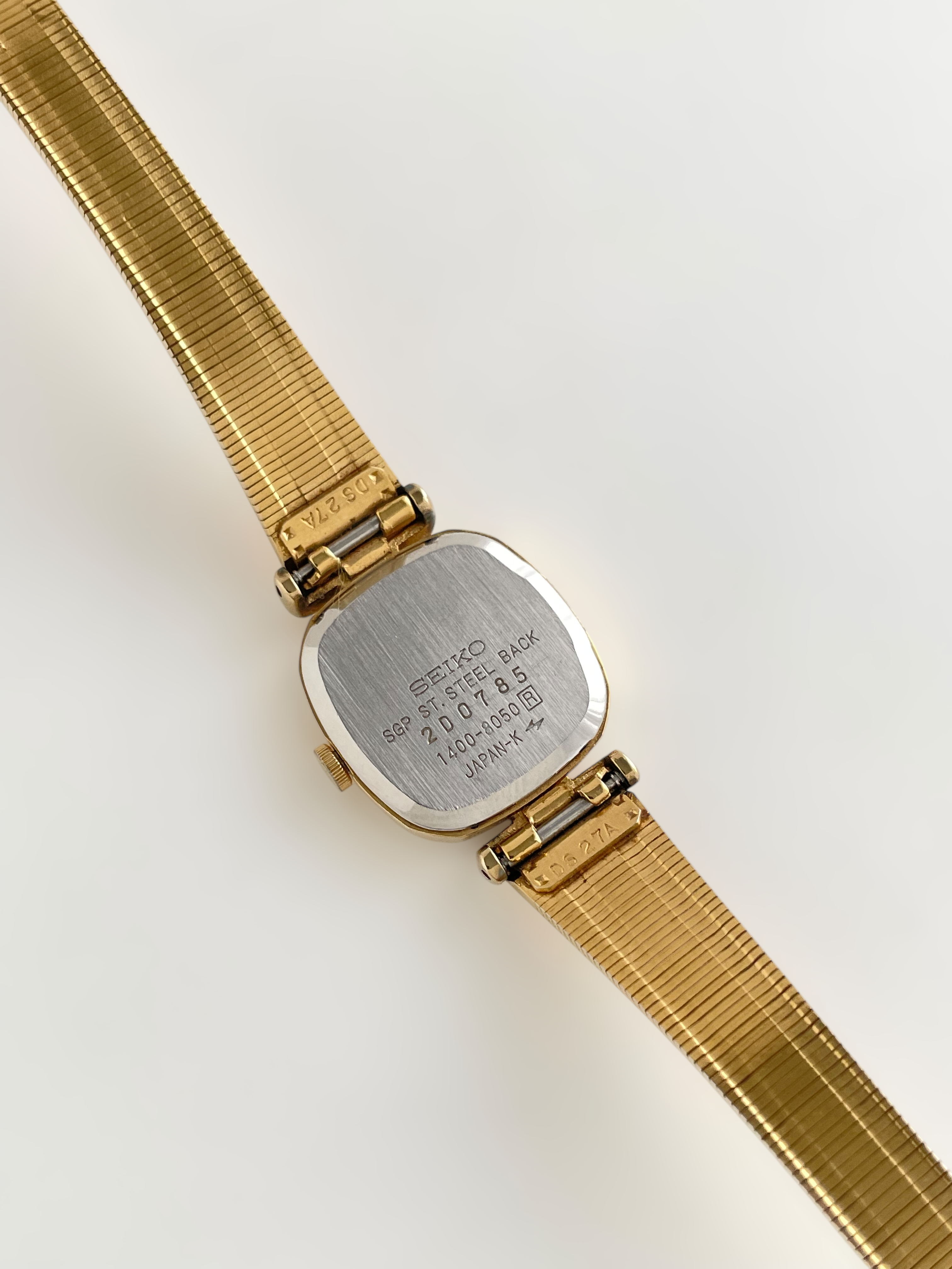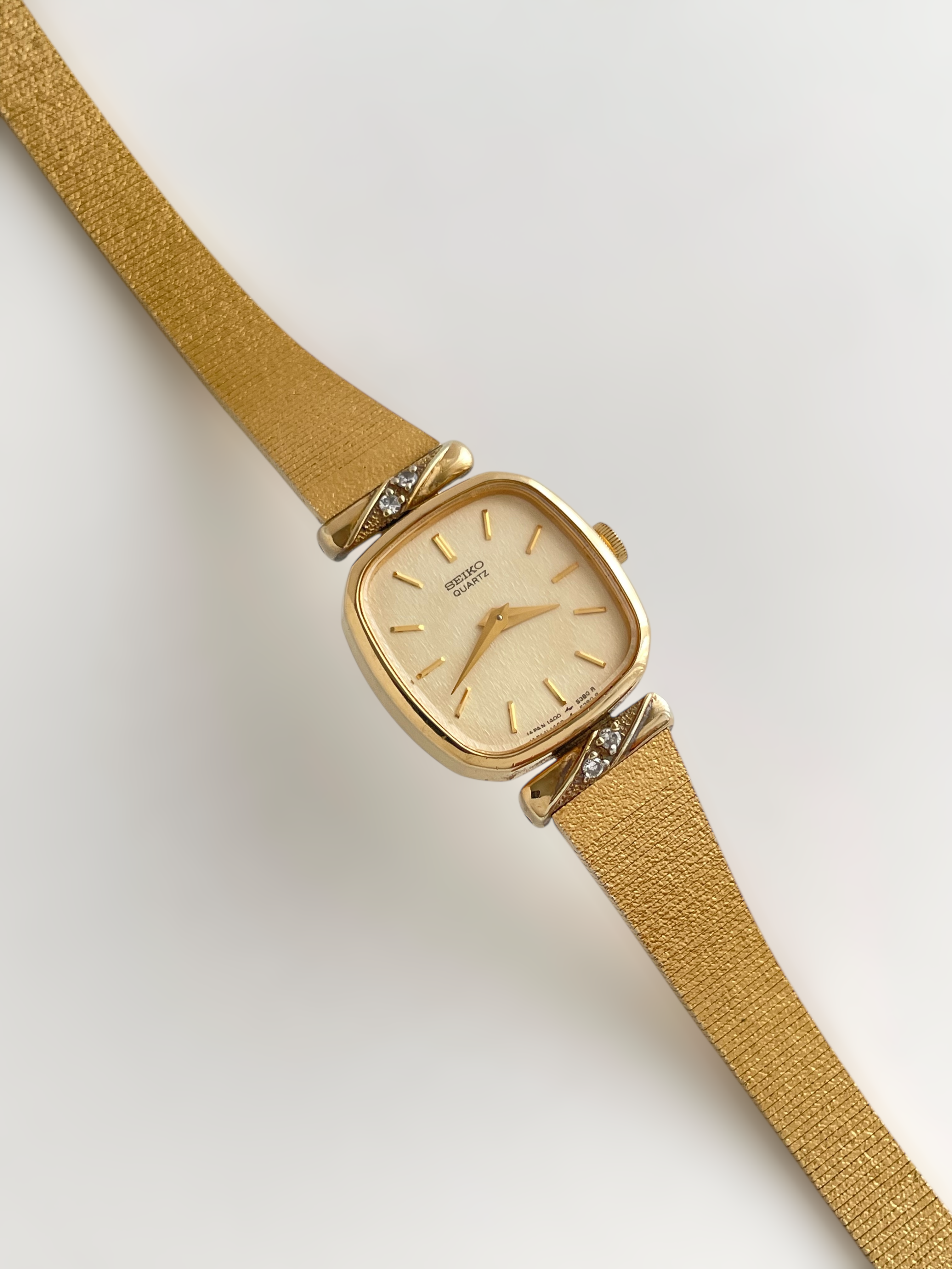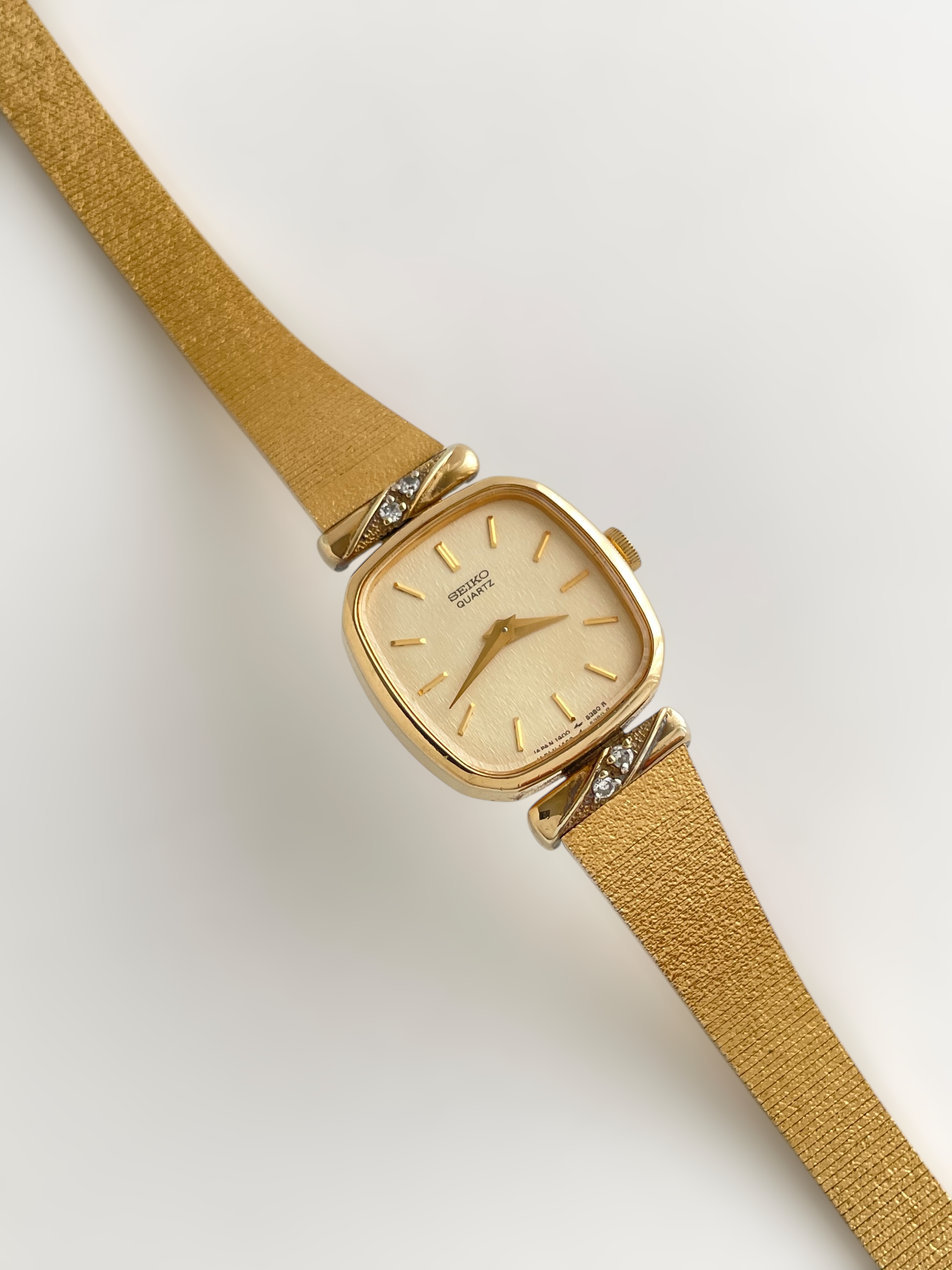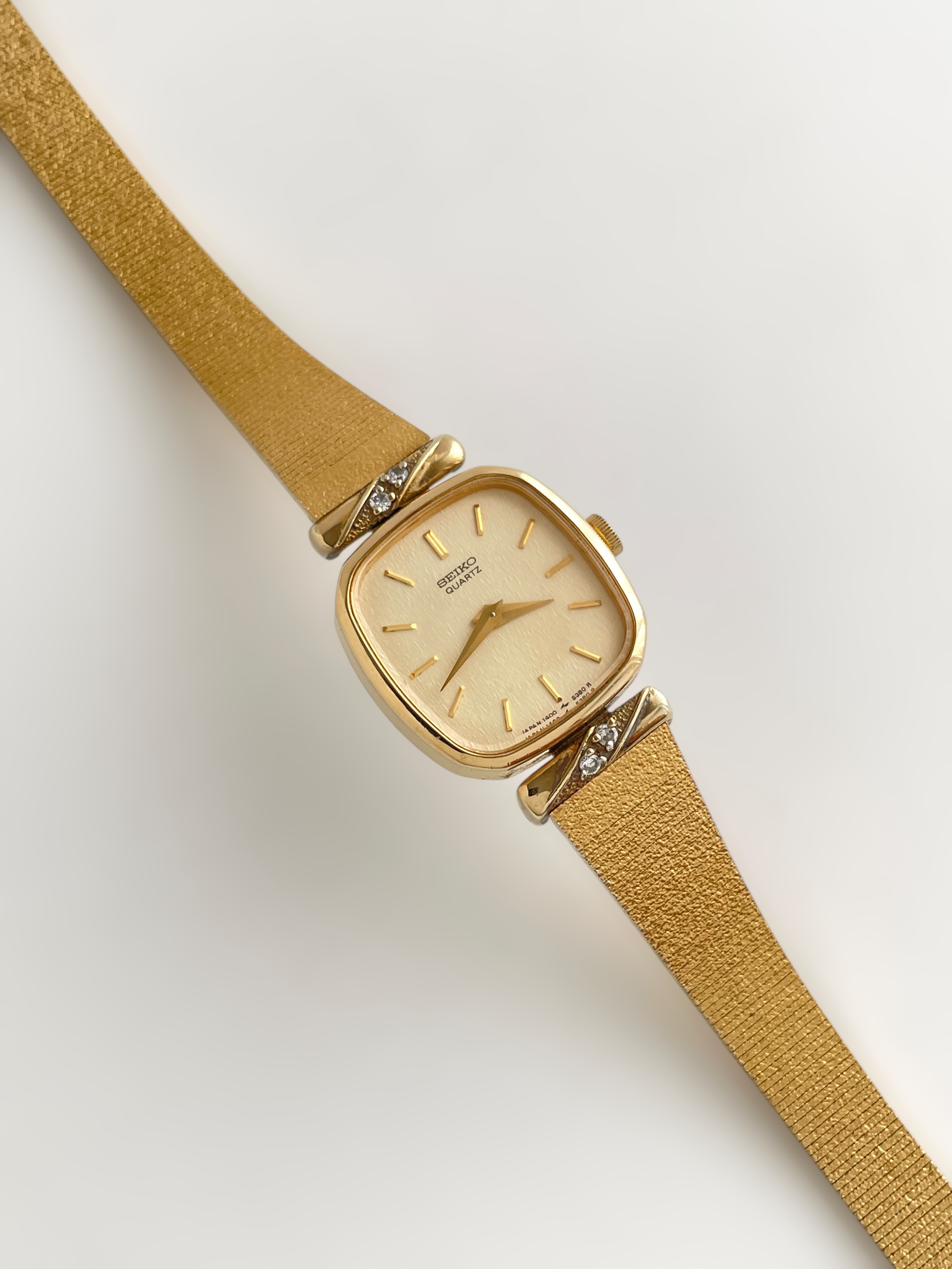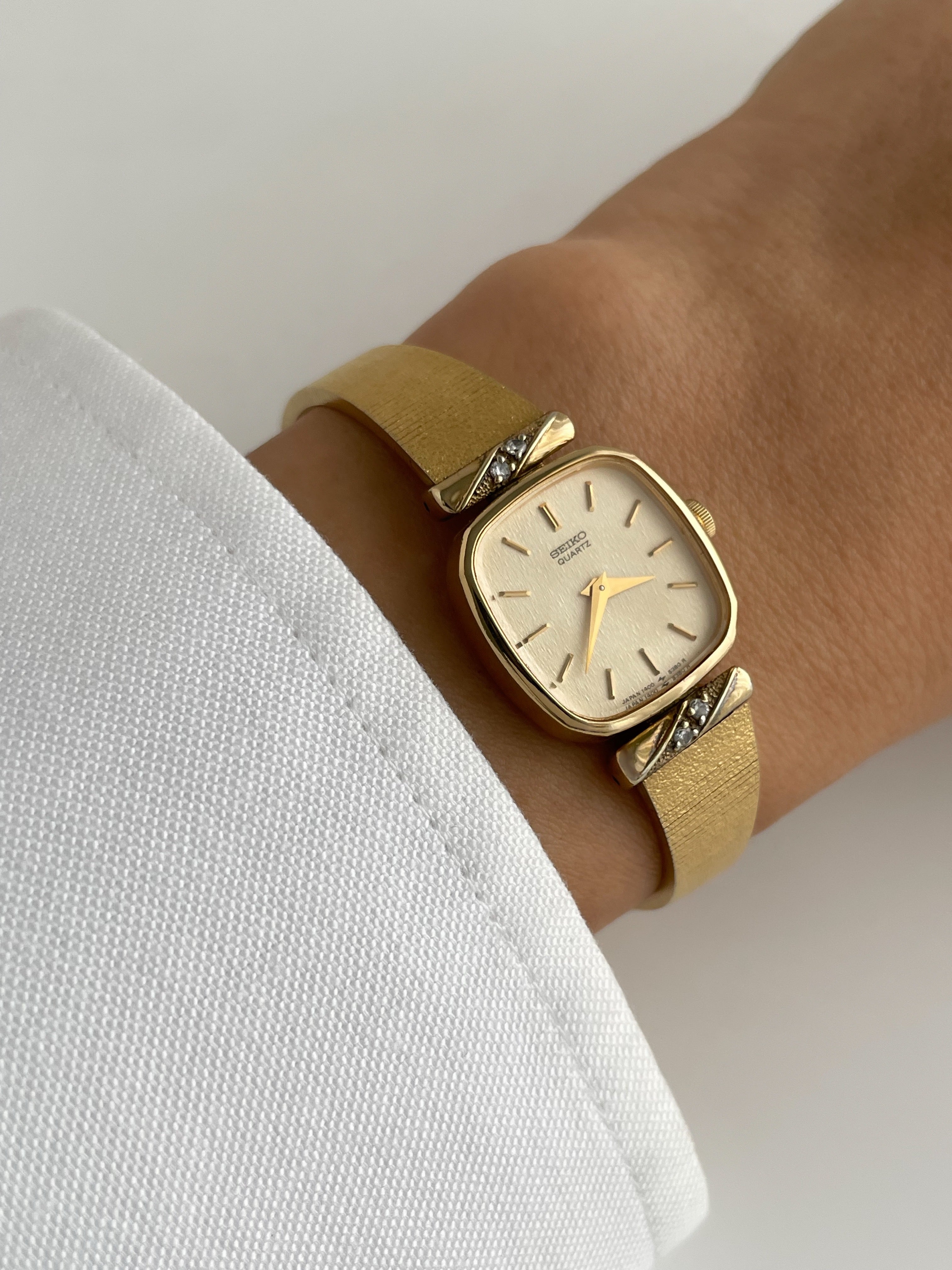 Beautiful vintage and gold plated Seiko watch with a flat bracelet design and a tank case adorned with four small genuine diamonds. Bracelet clasp closure with removable security chain.