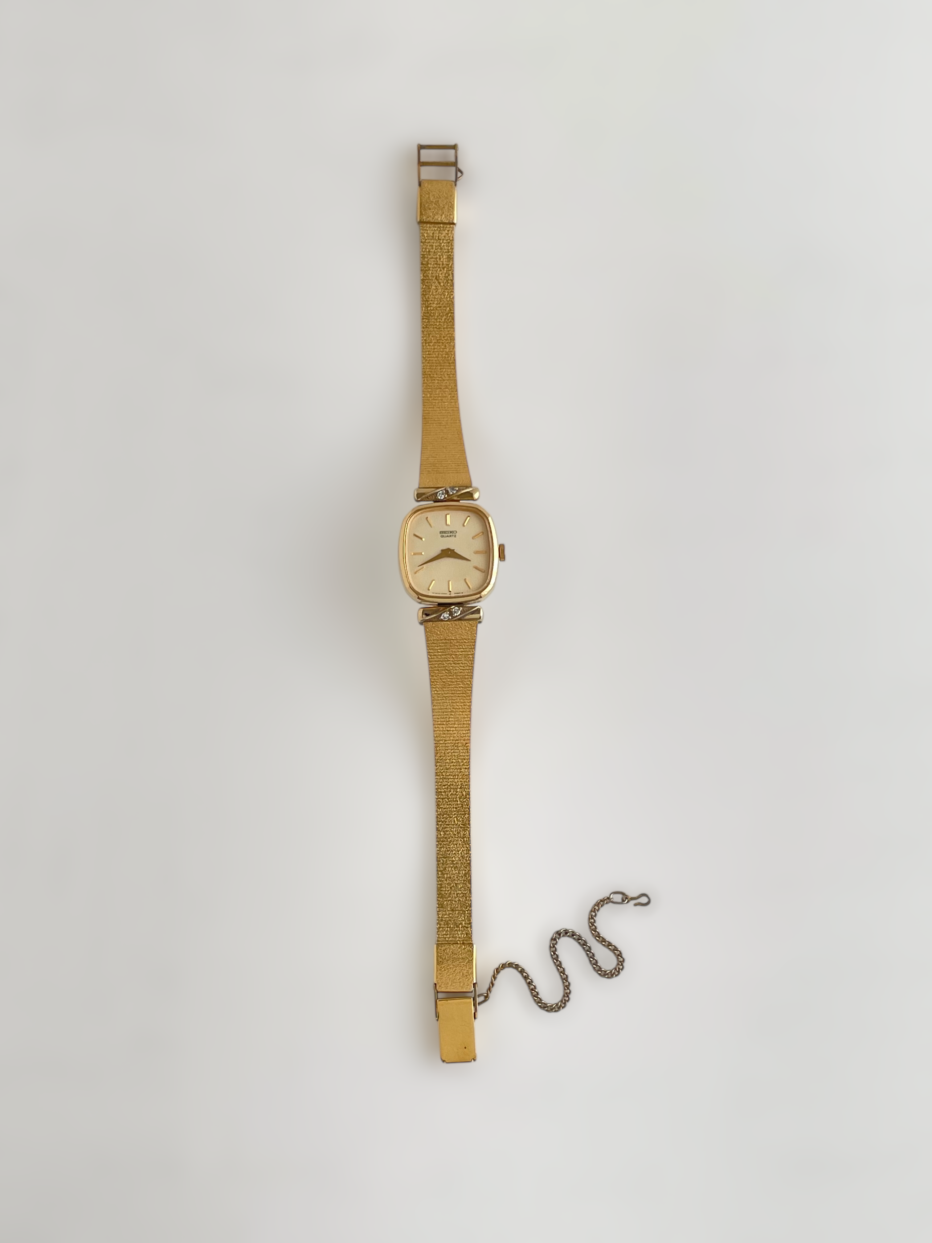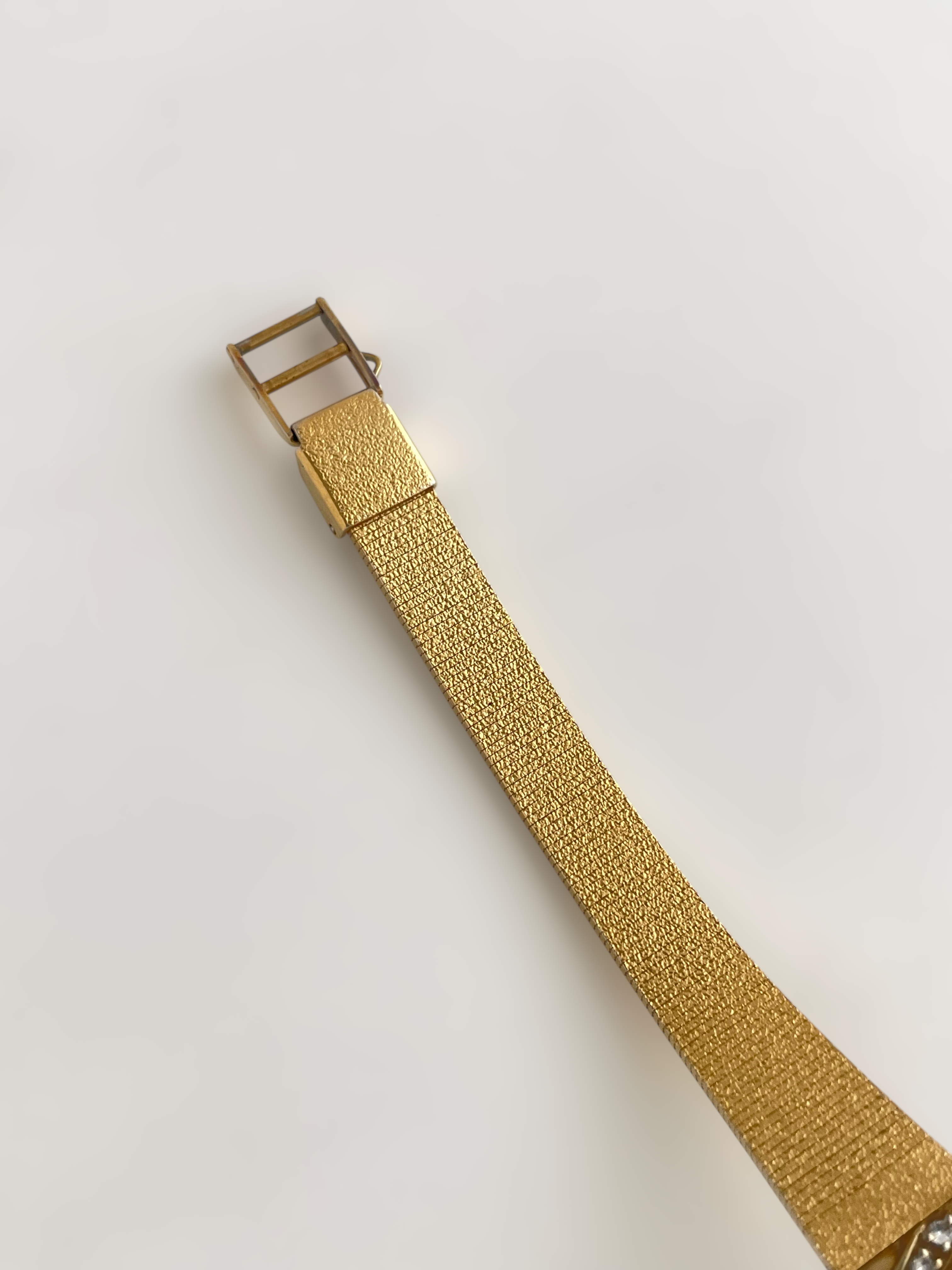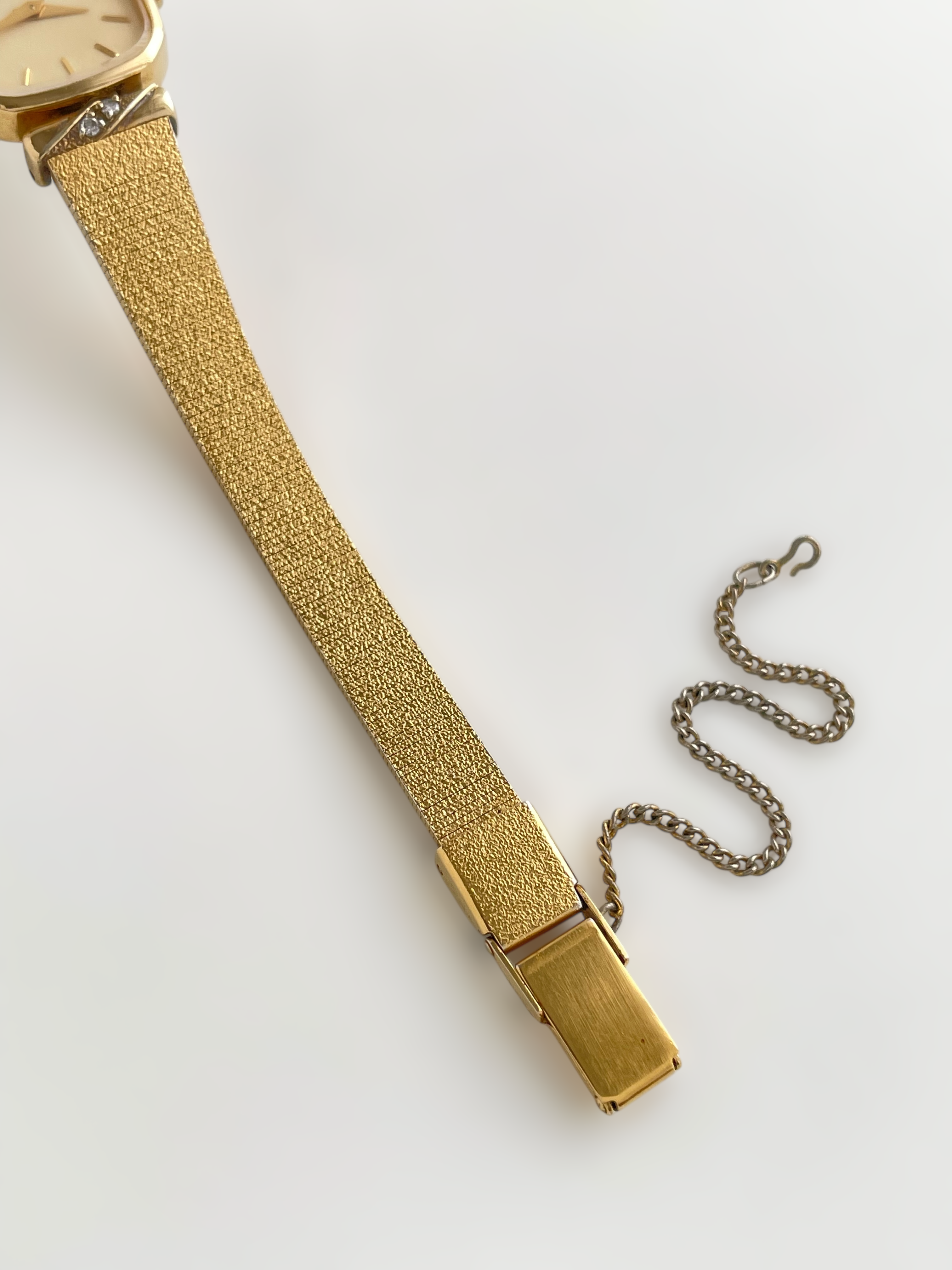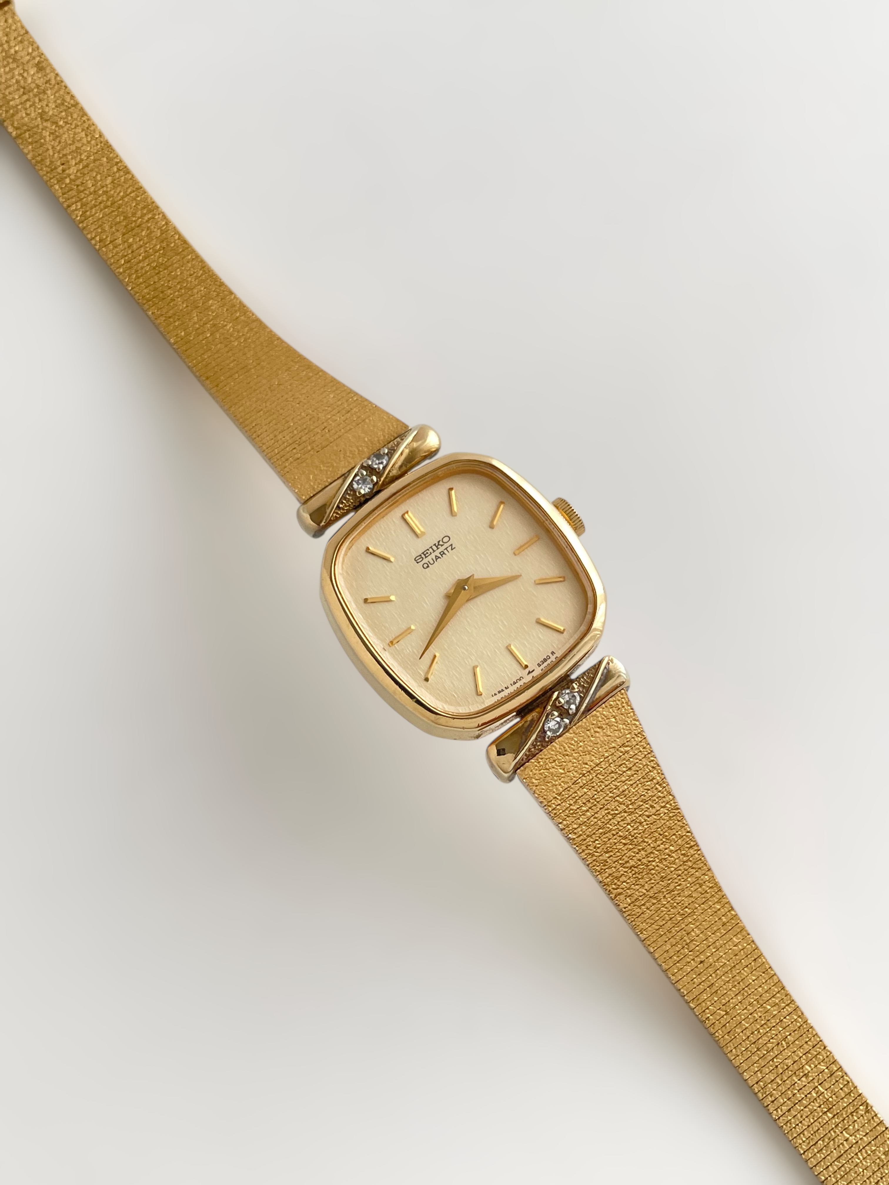 Beautiful vintage and gold plated Seiko watch with a flat bracelet design and a tank case adorned with four small genuine diamonds. Bracelet clasp closure with removable security chain.