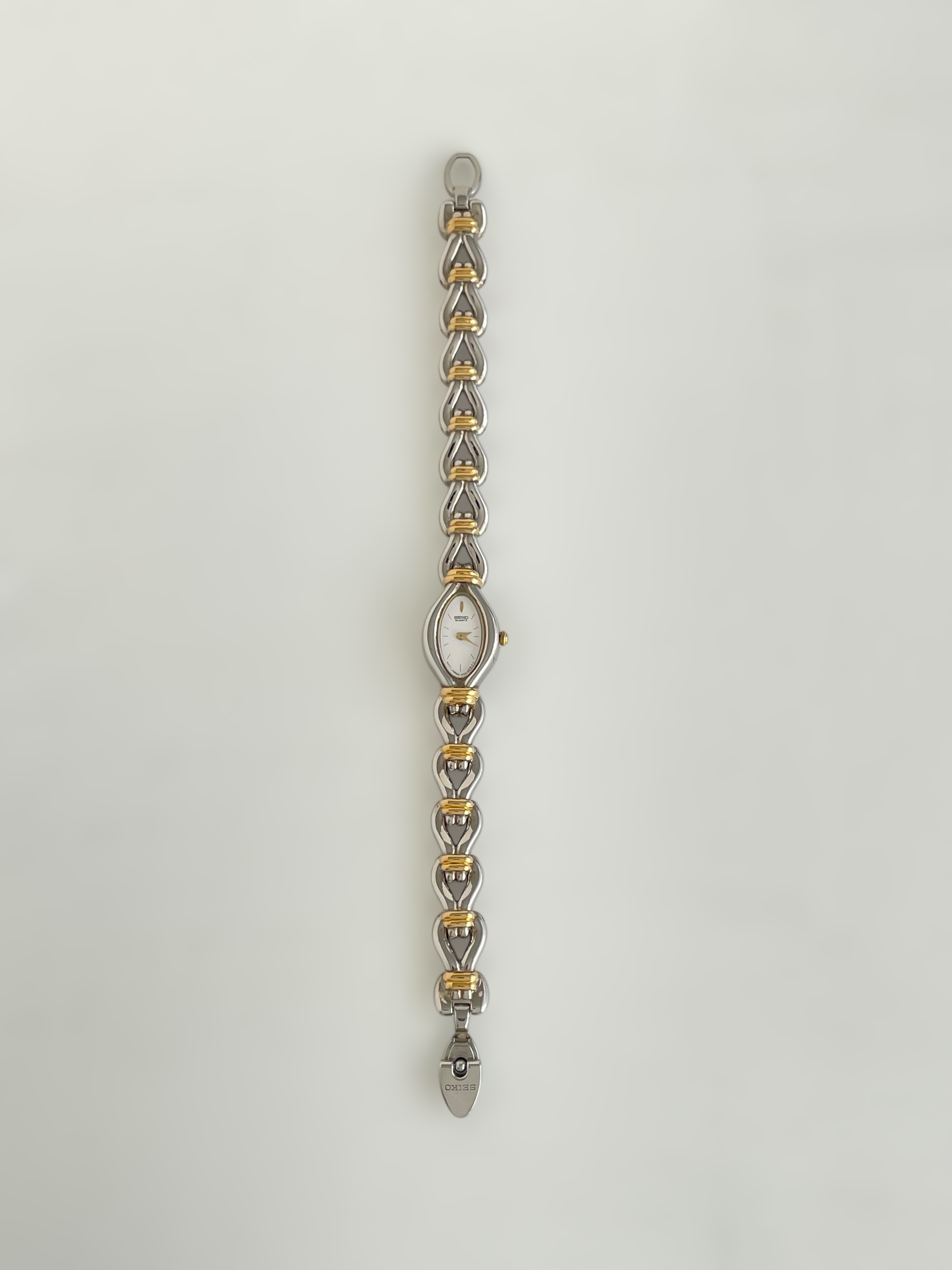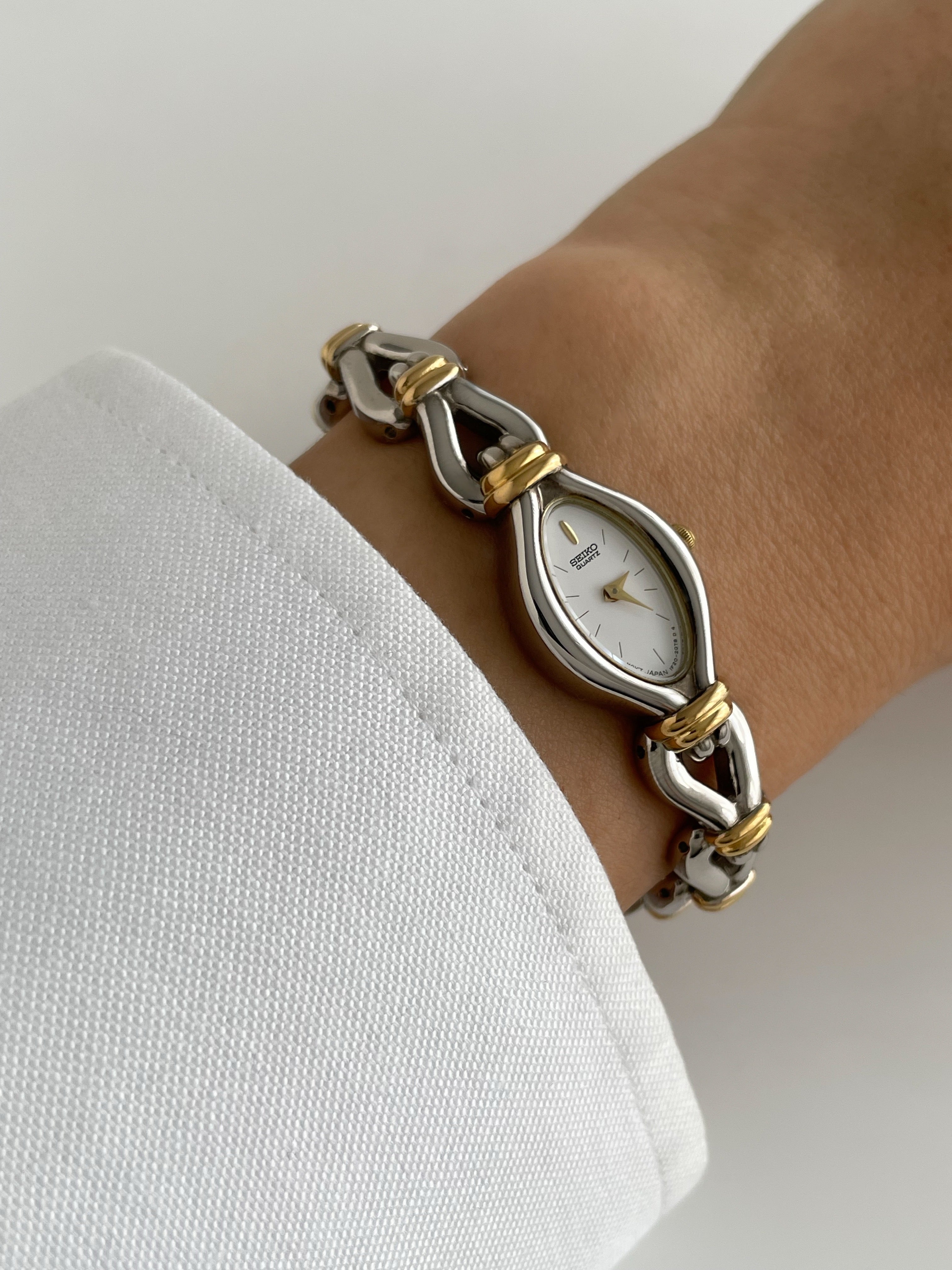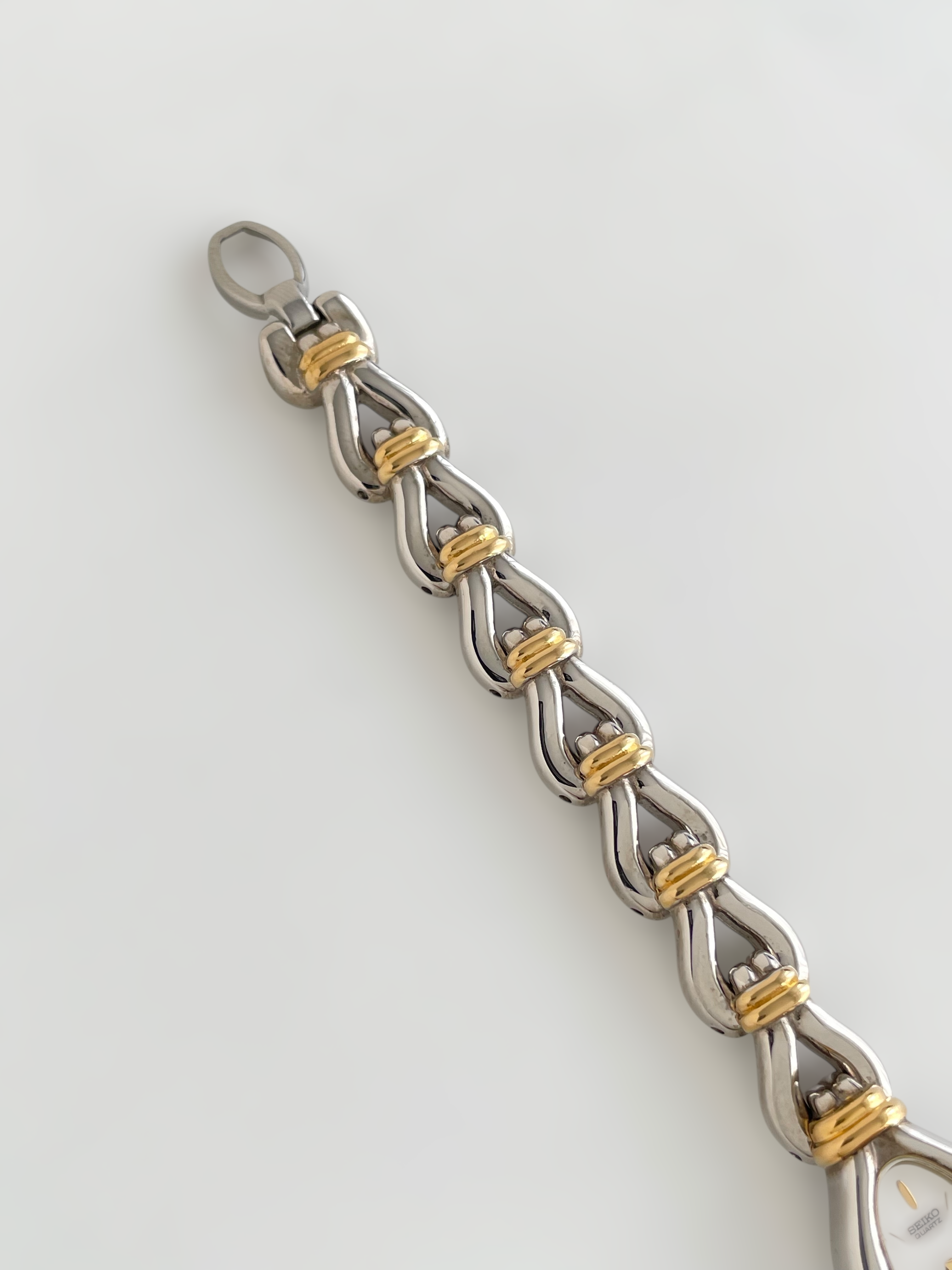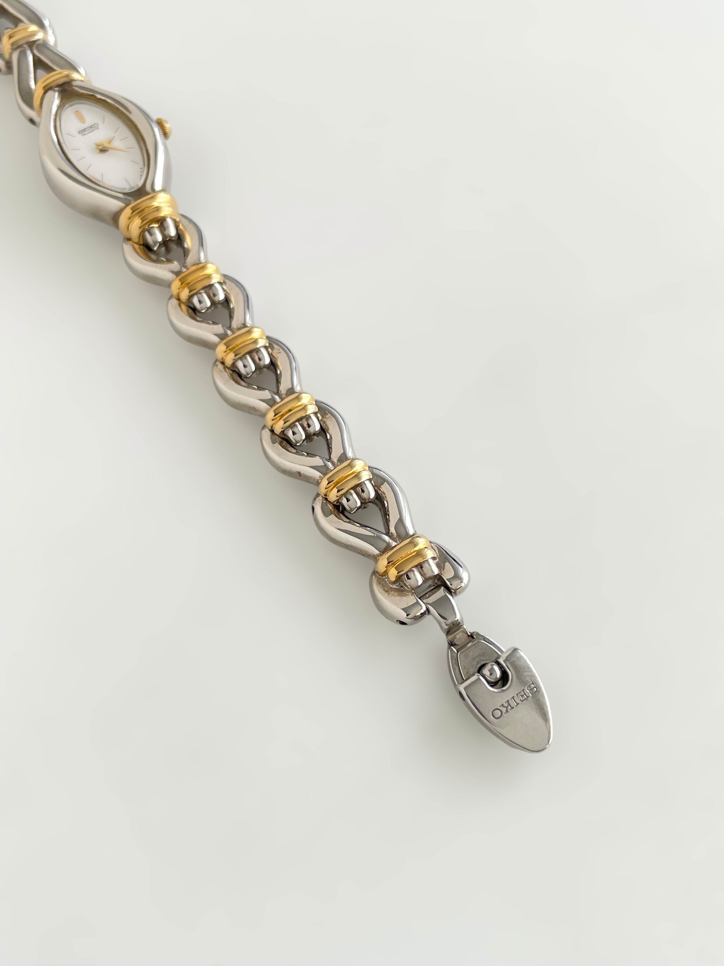 Gorgeous vintage and duotone Seiko watch with a unique bracelet design and a drop case. Bracelet clasp closure.
