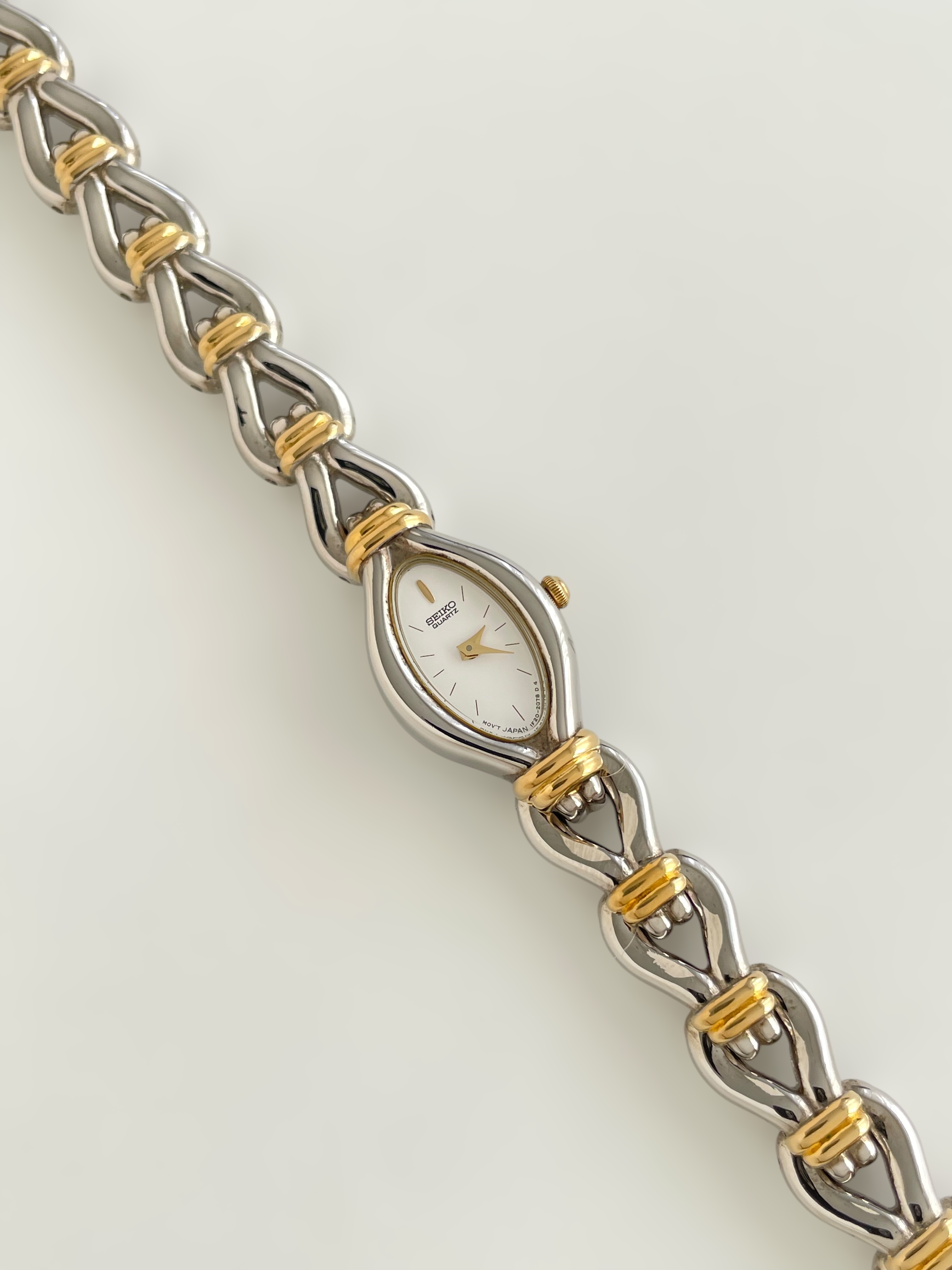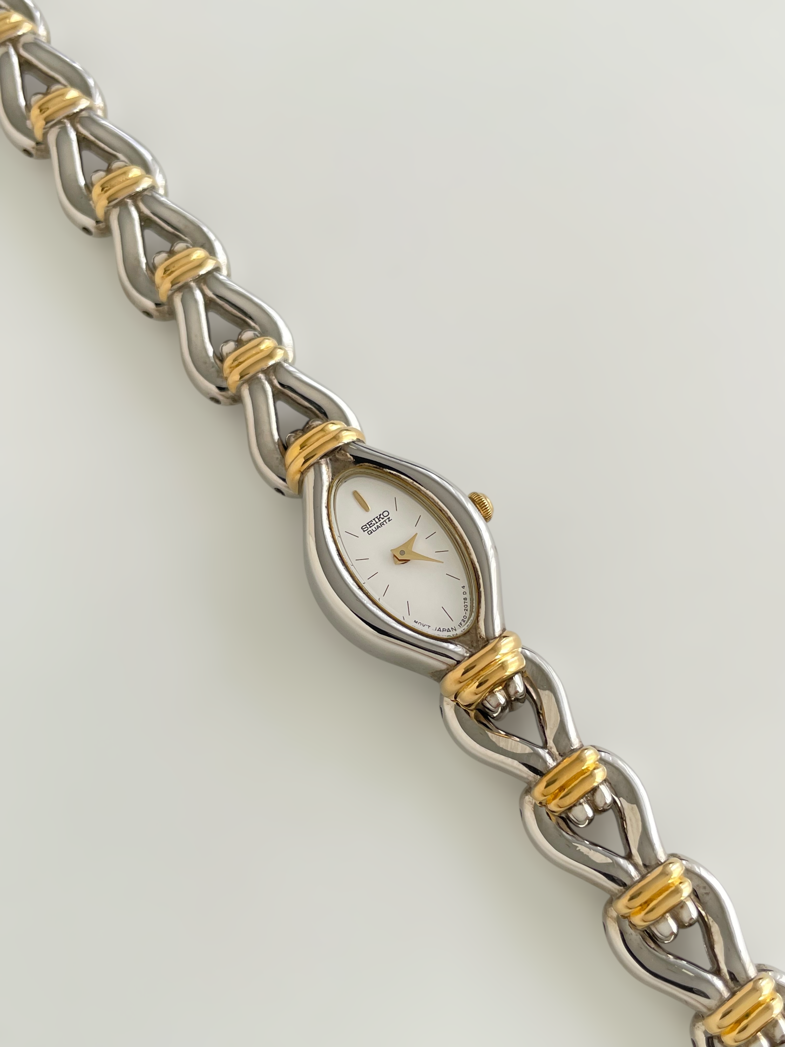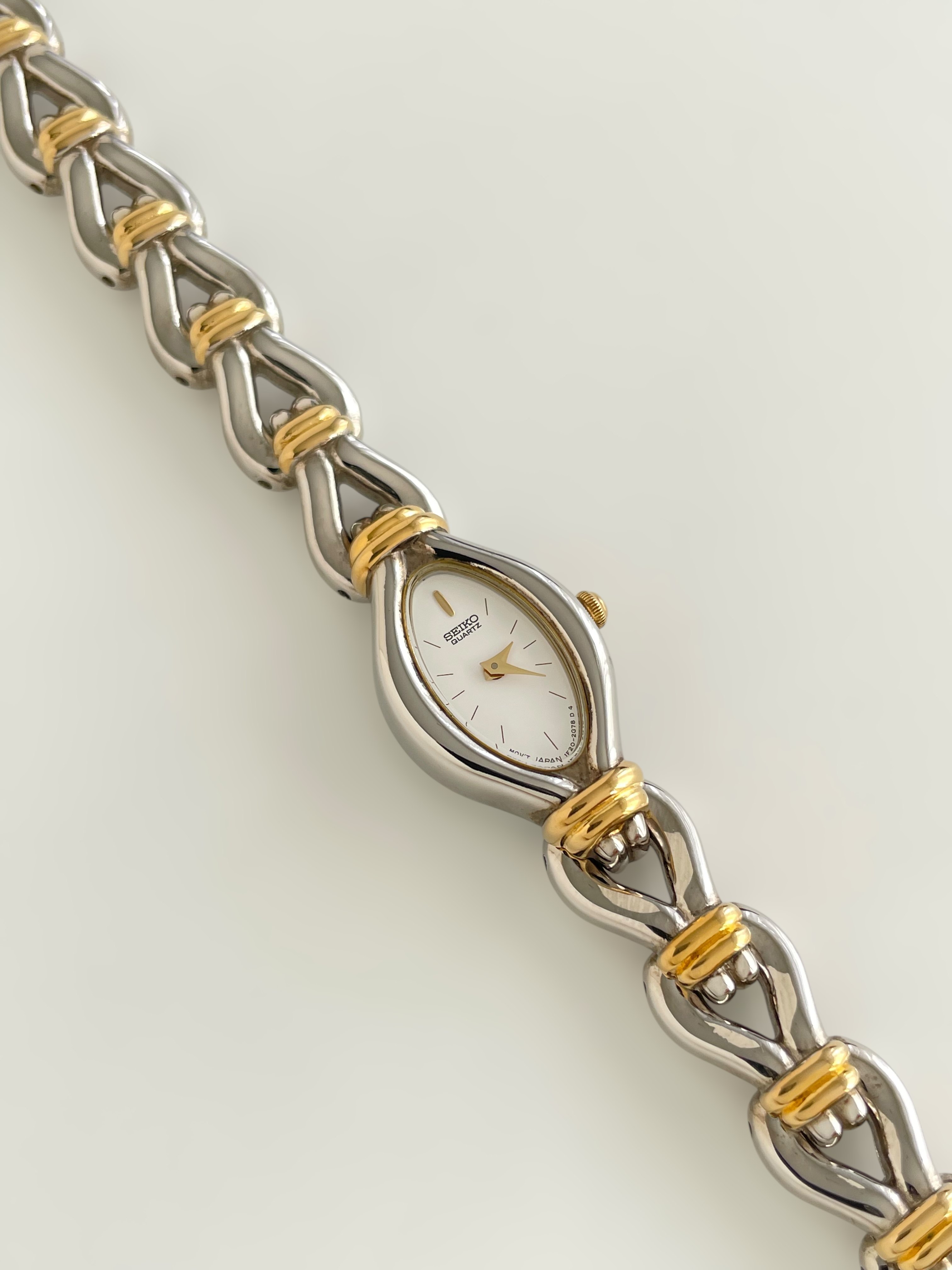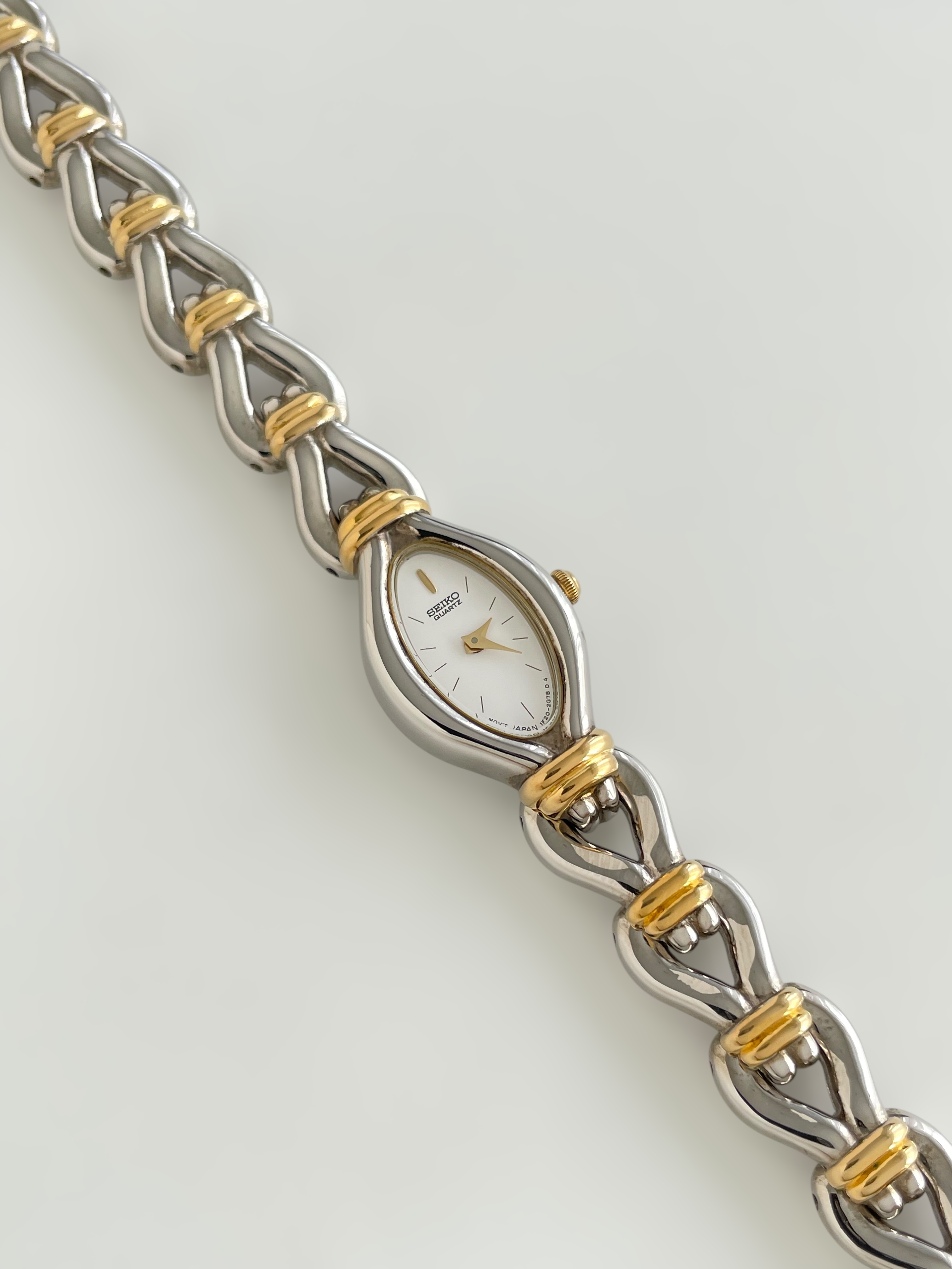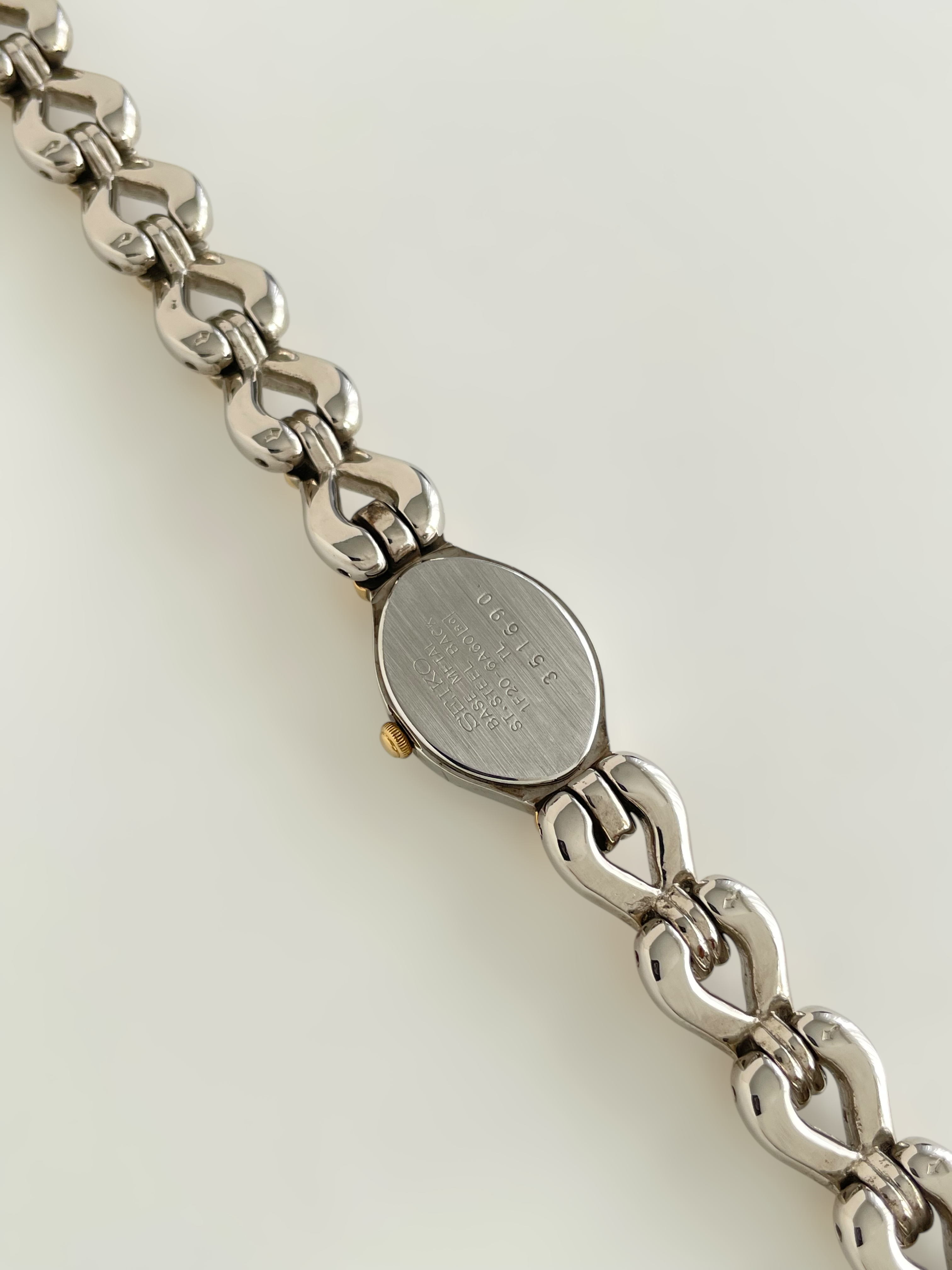 Gorgeous vintage and duotone Seiko watch with a unique bracelet design and a drop case. Bracelet clasp closure.