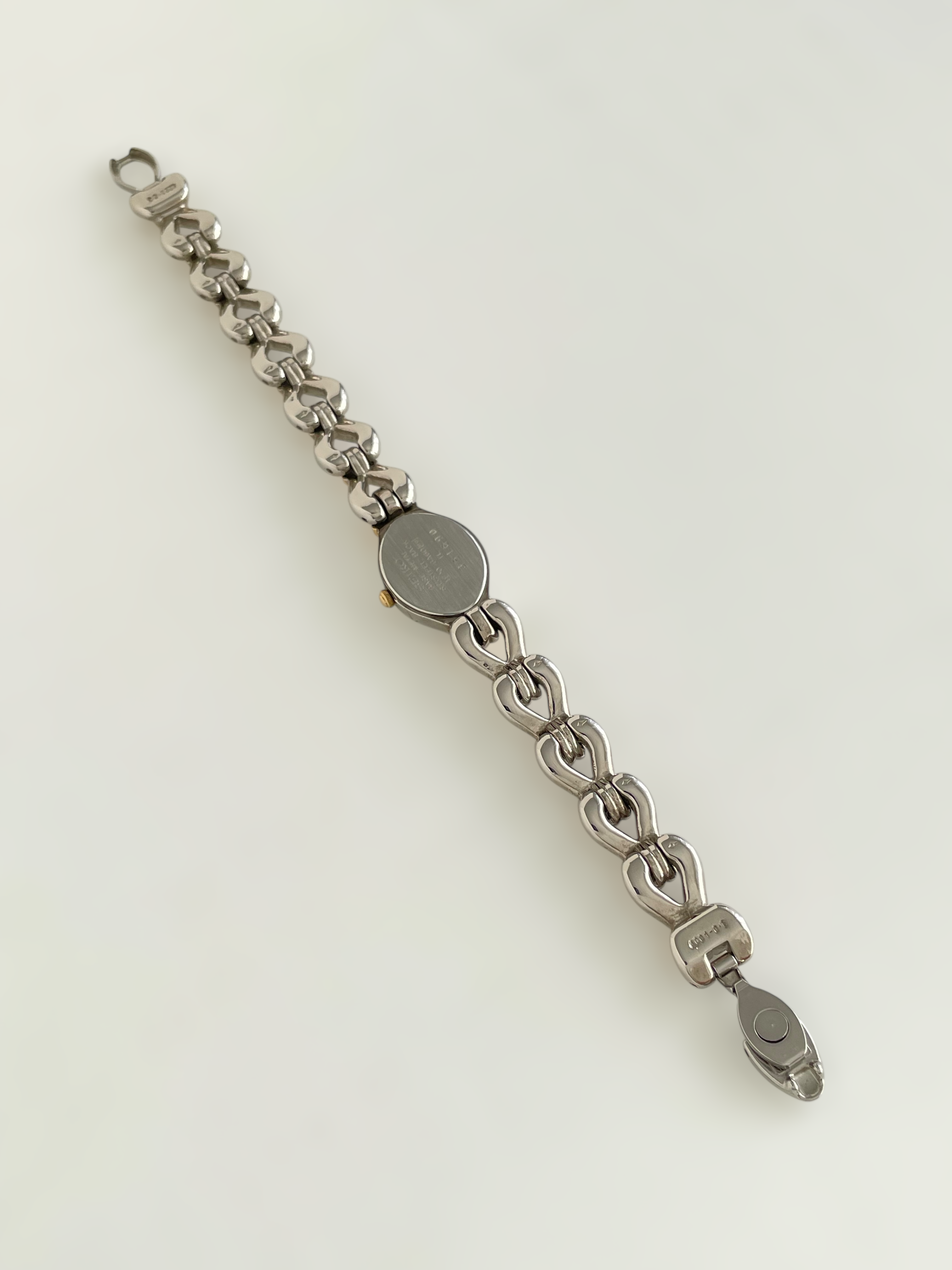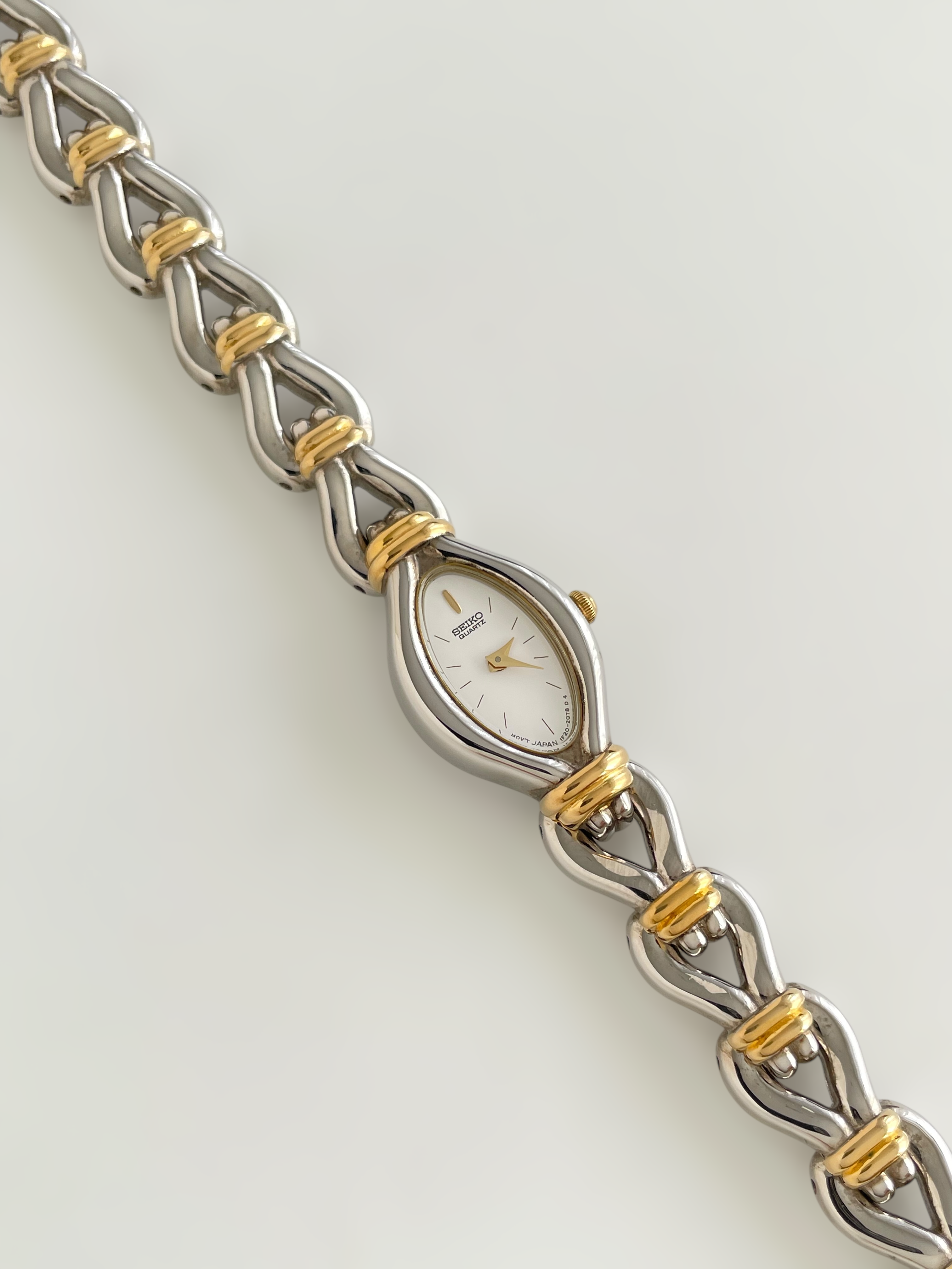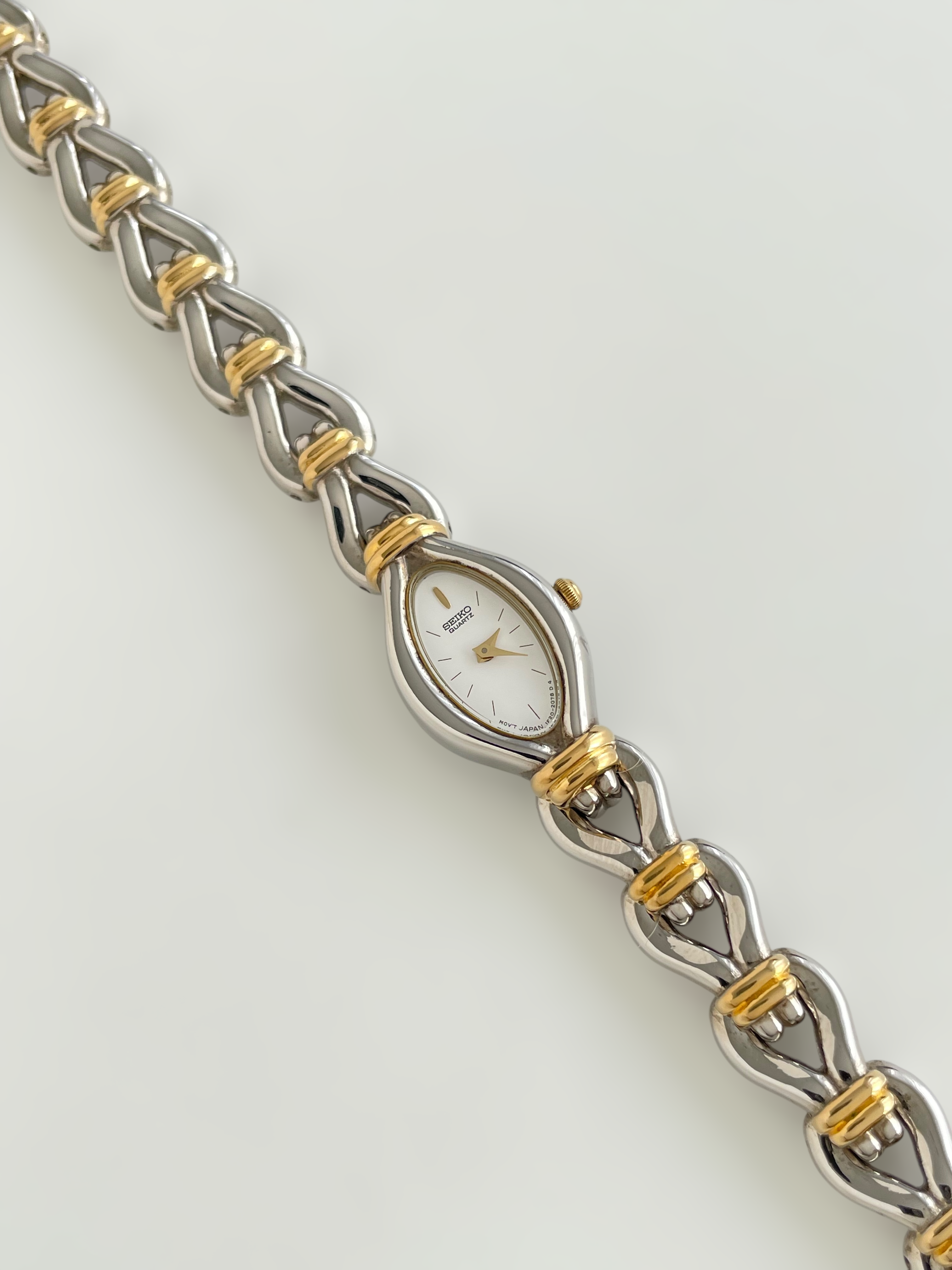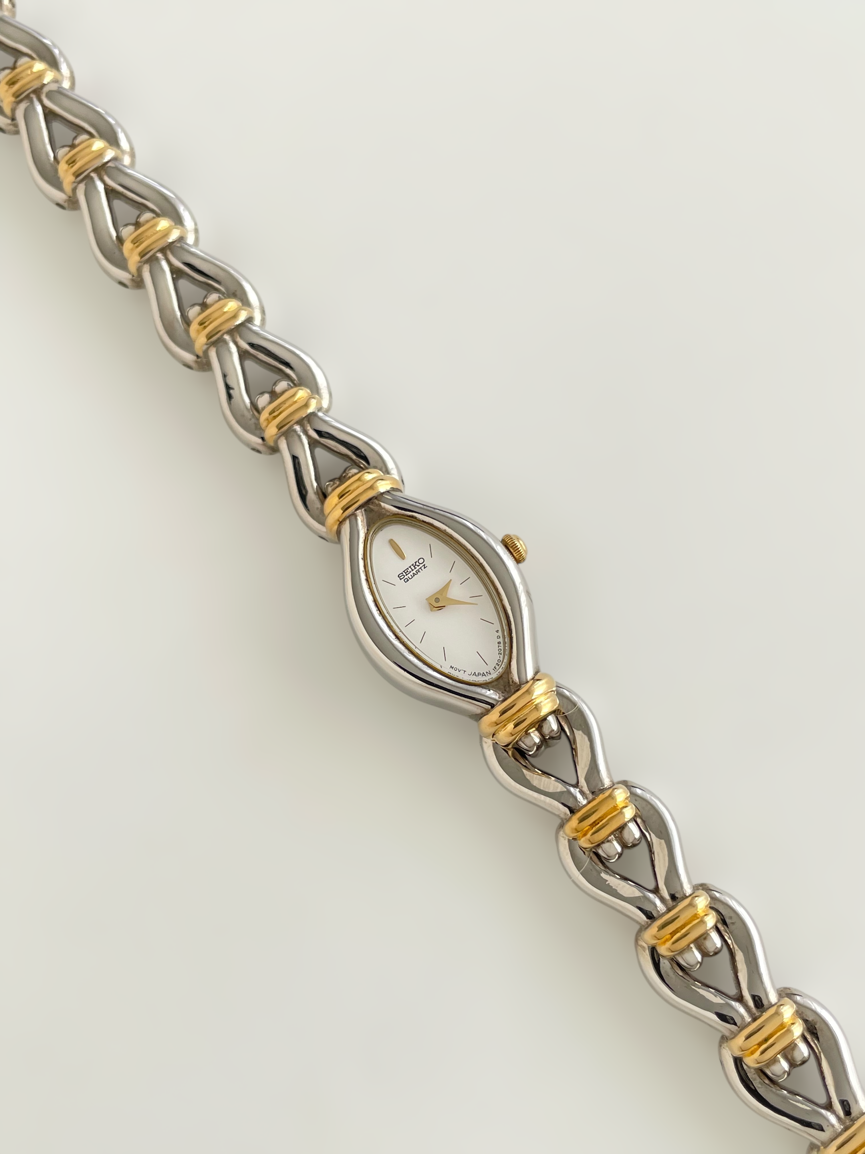 Gorgeous vintage and duotone Seiko watch with a unique bracelet design and a drop case. Bracelet clasp closure.